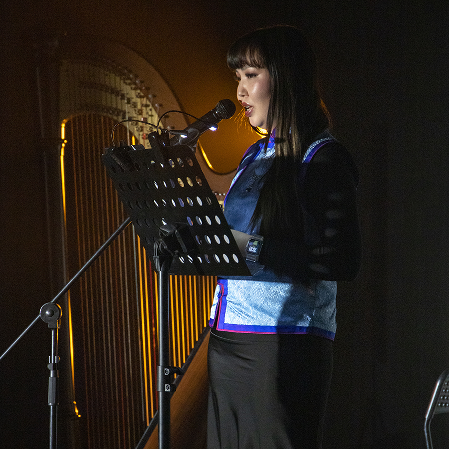 Представительница Красноярской бурятской национально-культурной автономии «Алтан Гэрэл» Инесса Дымбренова прочитала под музыкальный аккомпанемент Марата Садреева (каатон) и Люси Семёновой (флейта) очень красивое стихотворение современного бурятского поэта, музыканта, скульптора Элбэга Зандраева.