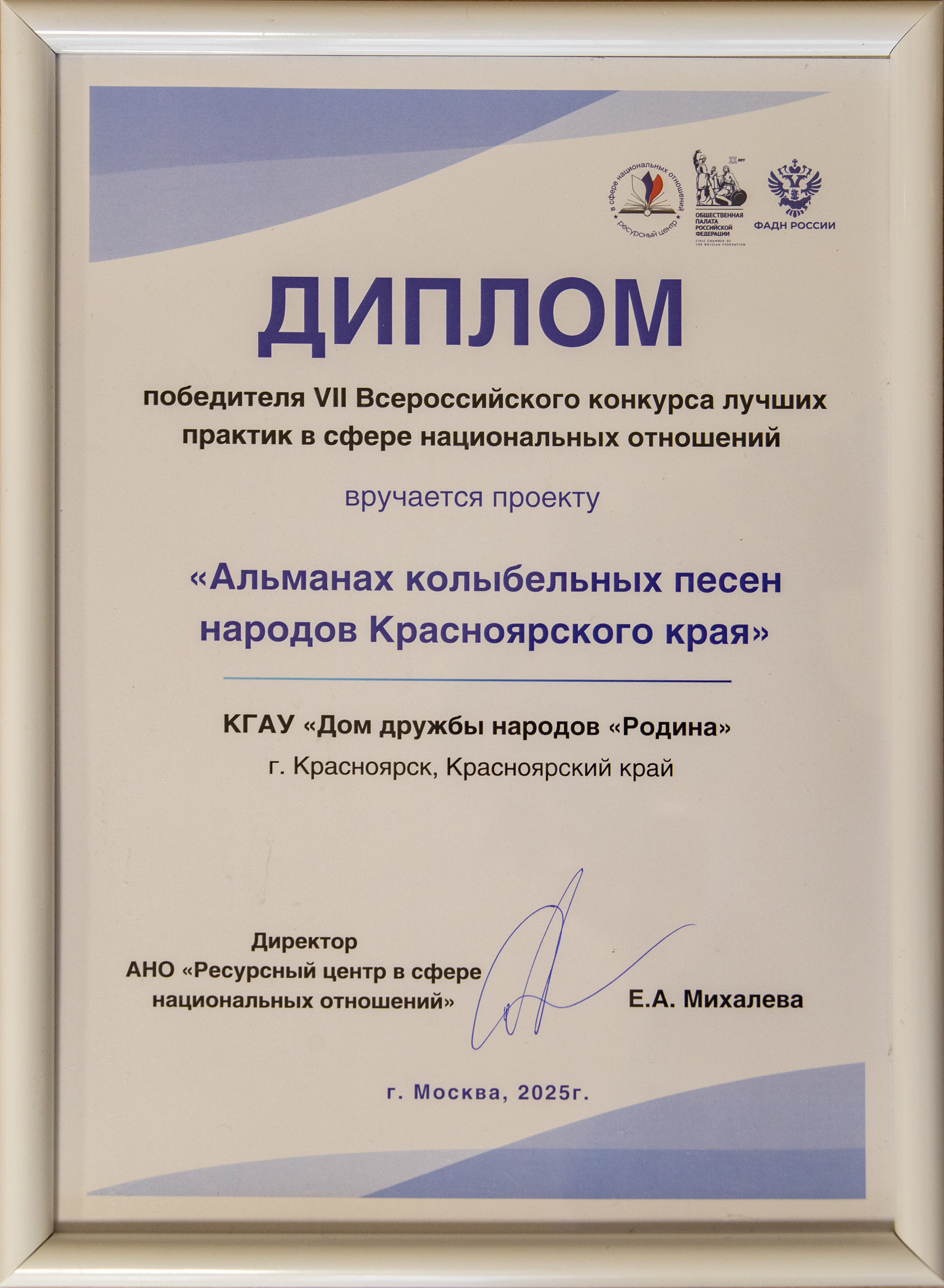 Дом дружбы народов Красноярского края «Родина» представил на конкурс «Альманах колыбельных песен народов Красноярского края», проект получил высокую экспертную оценку и был признан победителем.