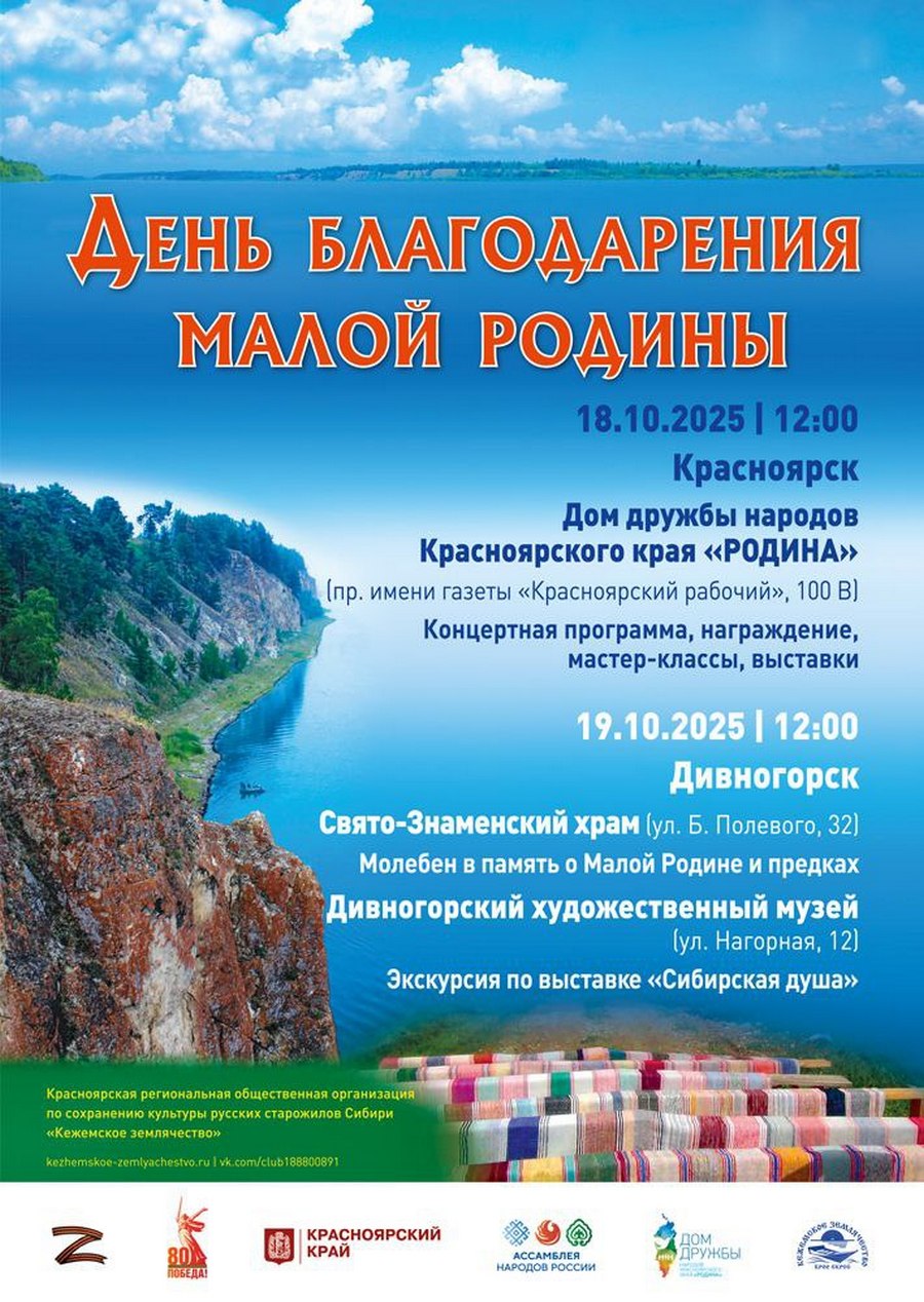 18-19 октября 2025 года Кежемское землячество проведет День благодарения Малой Родины. Мероприятие продолжает традиции выдающегося общесибирского праздника «День благодарения Сибири» (или «День Сибири»), учреждённого в 1881 году в честь 300-летия «Ермакова пришествия». В этот день старожилы-сибиряки благодарили Сибирь за её богатства и изобилия, проводили молебны.