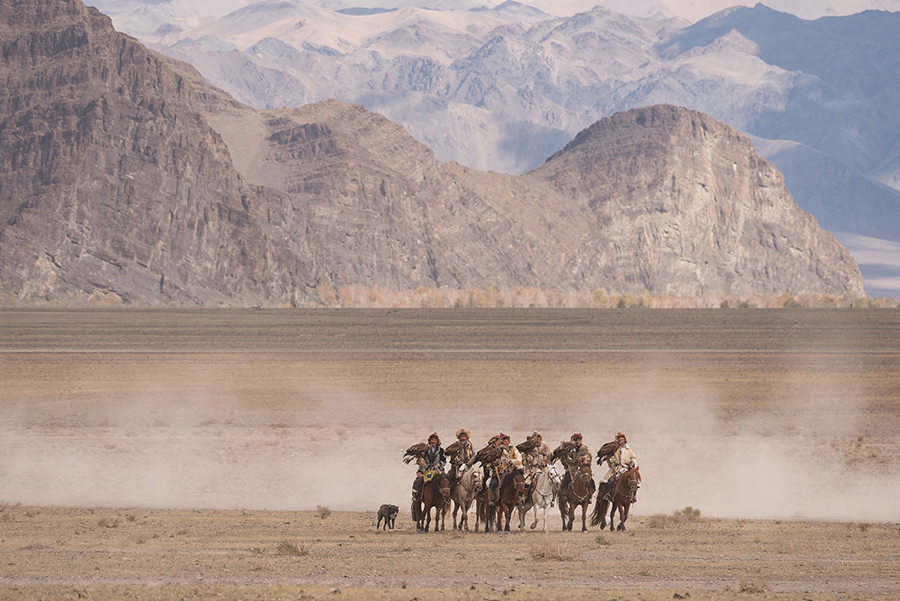 Всадники с орлами выстраиваются в колонну и делают несколько кругов перед зрителями по полю, где будут проходить состязания. В этой же колонне едут и наездники на верблюдах.
