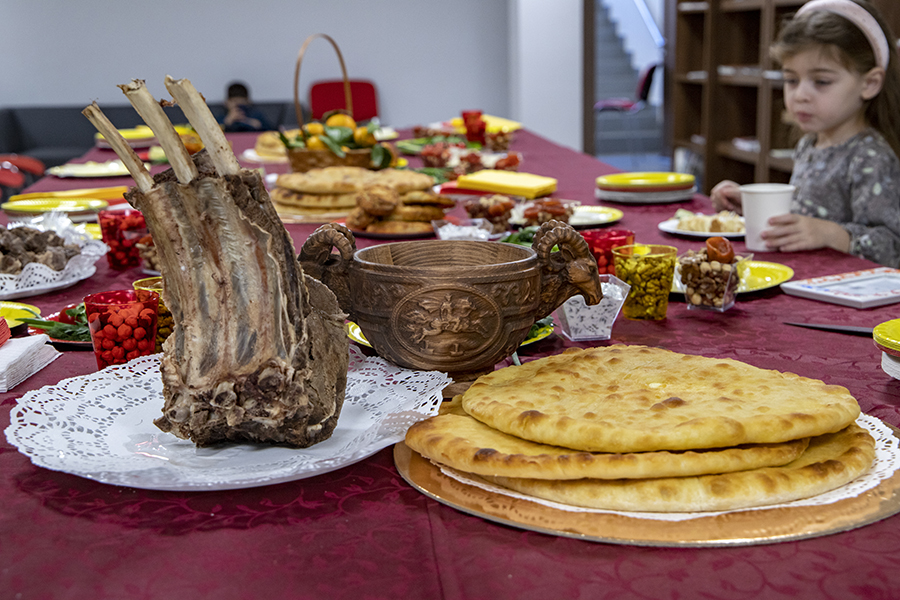 Старейшина приветствовал собравшихся и прочитал молитву, благословив стол. По традиции, первый кусок пирога и мяса предложили самому младшему участнику мероприятия.
