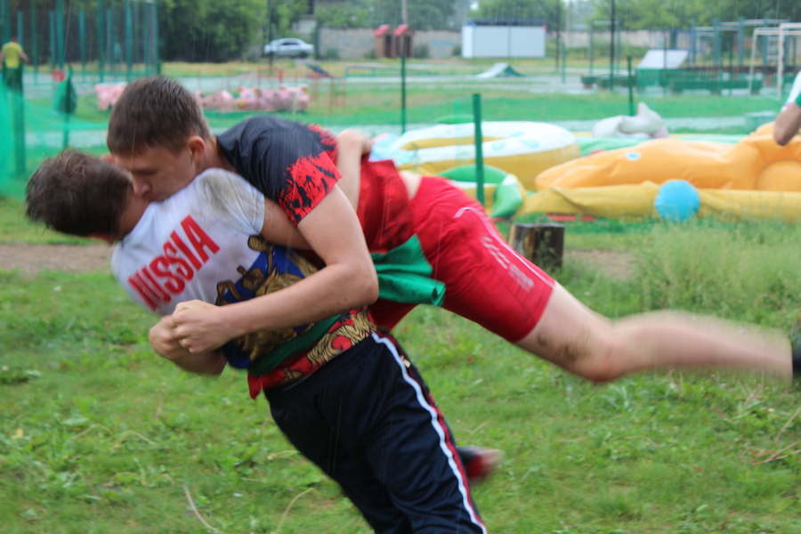 Центральной частью праздника стали состязания: борьба «Корэш», бой с мешками на бревне, восхождение на вертикальный шест, забеги в мешках и с коромыслом, метание березовых веников, перетягивание каната, ходьба на ходулях, поднятие гири и т.д.