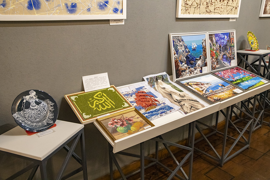 На суд компетентного жюри были представлены изделия декоративно-прикладного искусства, которые были выставлены на всеобщее обозрение. Чего здесь только не было: вышитые бисером «Шамили» (араб. - «оберег»), картины, тарелки с точечной росписью, орнаментированные полумесяцы, вязанные изделия. Всё изготовлено тщательно, с любовью и усердием.