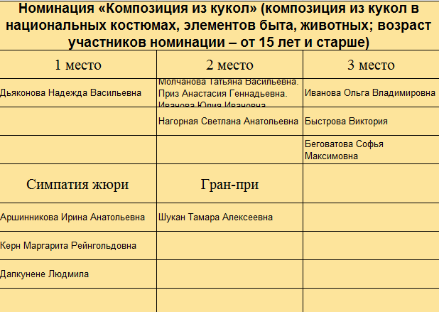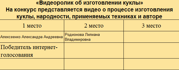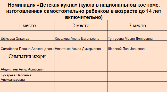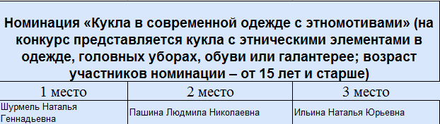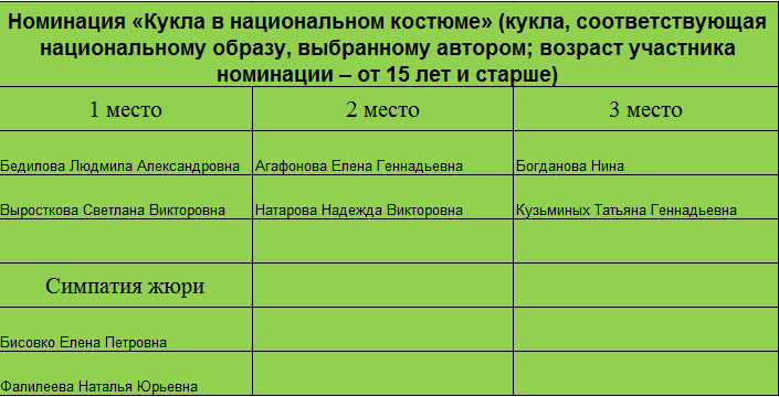 Подведены итоги межнационального конкурса «Кукла в национальном костюме». По итогам заседания членов жюри конкурса, которе состоялось 27 октября, определены следующие победители номинаций конкурса:
