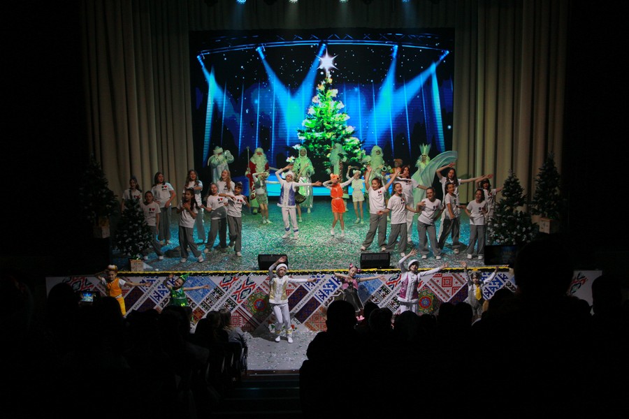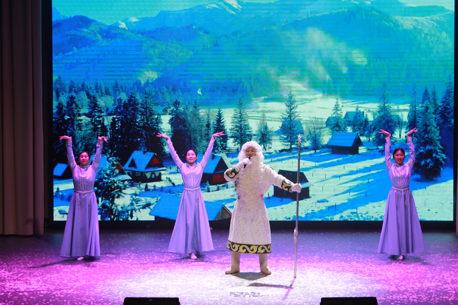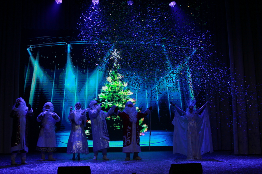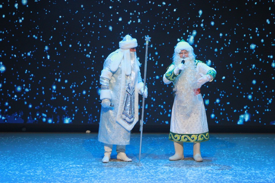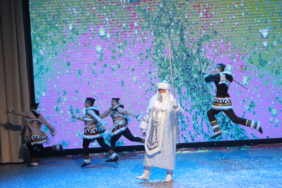 Интерактивная программа прошла в зрительном зале. Ребятишек поздравляли сразу четыре новогодних волшебника: русский Дед Мороз, эвенкийский Амака Иини, бурятский Сагаан Убгэн, татарский Кыш Бабай. Дети узнали о традициях празднования Нового года у разных народов, разучили танцы и прогнали Вьюгу, которая пыталась испортить праздник.