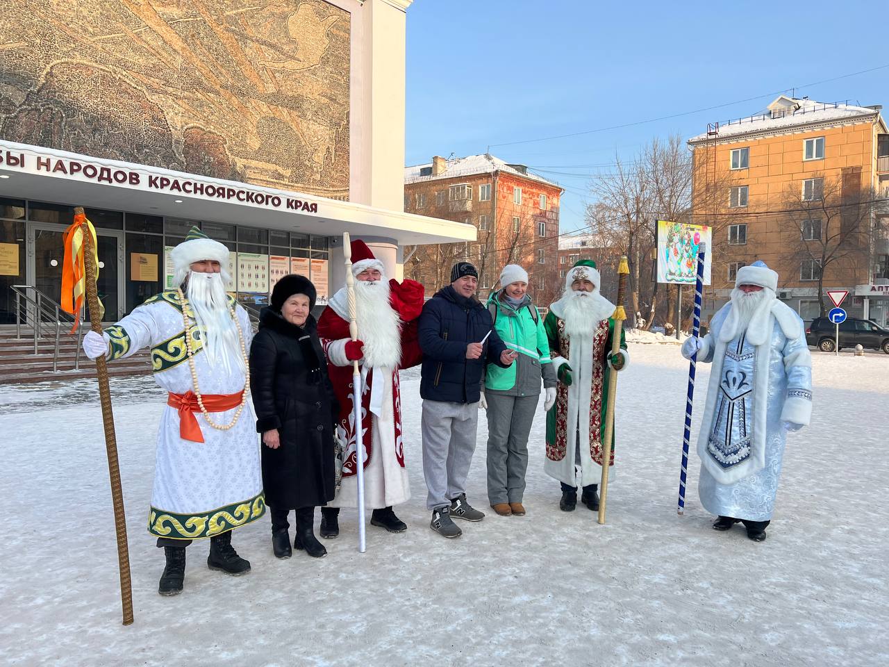 Сегодня около Дома дружбы народов «Родина» красноярцев поздравляли сразу четыре новогодних волшебника: русский Дед Мороз, эвенкийский Амака Иини, бурятский Сагаан Убгэн, татарский Кыш Бабай.