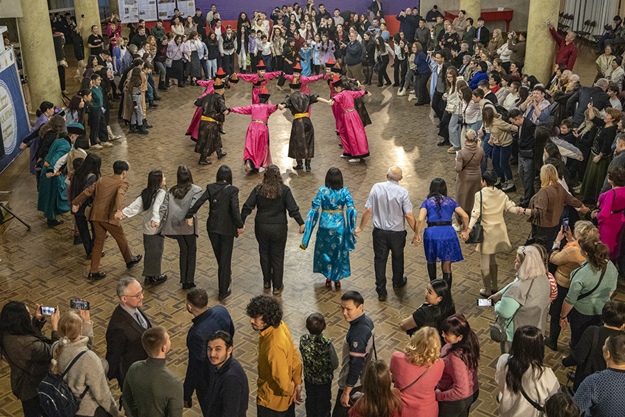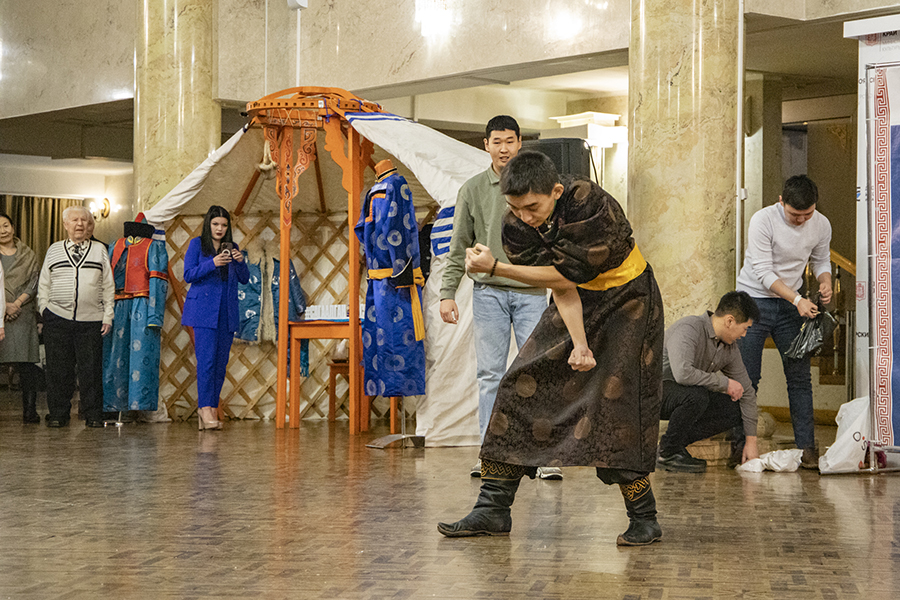 По традиции, знакомство с бурятской культурой у гостей начиналось еще до входа в зрительный зал. В колонном зале Дворца Труда развернулась выставка предметов быта, национальных украшений и костюмов. Здесь же проходил мастер-класс по игре в кости «Шагай наадан».
