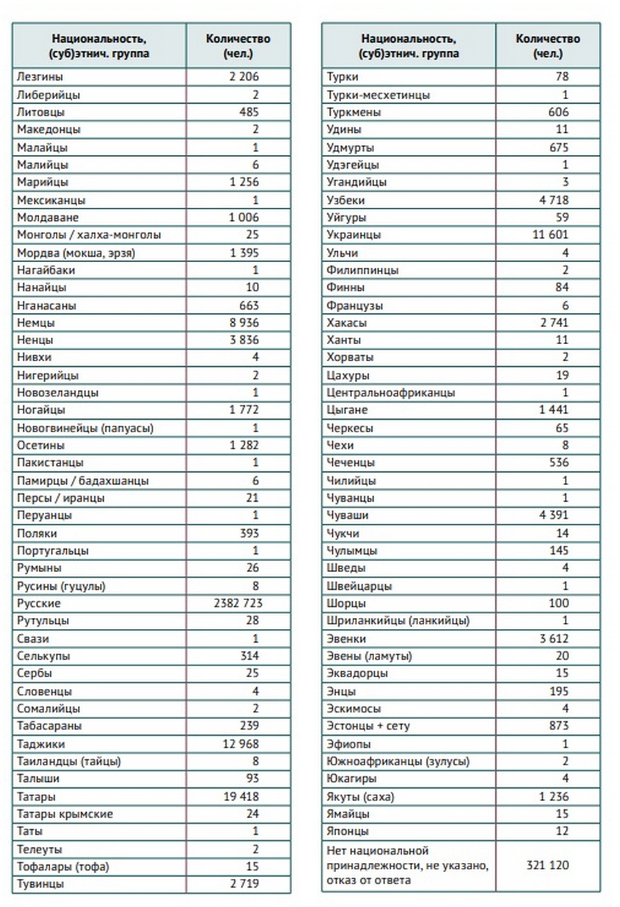 Данная цифра вызывает скепсис у специалистов-этнологов, так как по итогам предшествующих переписей населения количество национальностей Красноярского края шло по нарастающей, составляя 124 этноса в 1989 году, 137 — в 2002 году и 159 — в 2010 году**. Тем более что за последнее десятилетие красноярские вузы стали активно привлекать студентов из Латинской Америки, Африки, Юго-Восточной Азии и стран Карибского бассейна.