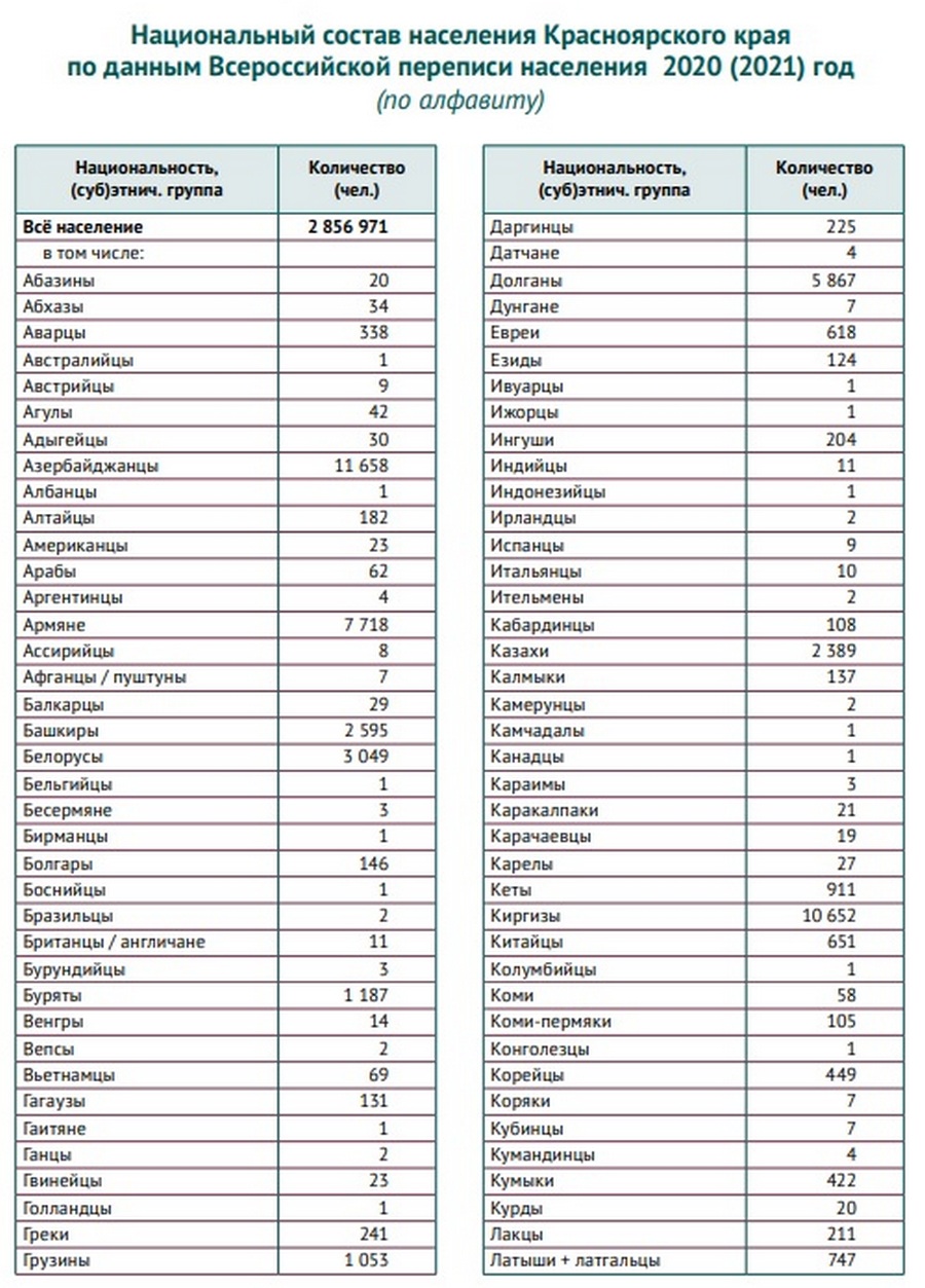 В январе 2023 года на сайте Росстата были опубликованы итоговые таблицы Всероссийской переписи населения 2020 года (ВПН — 2020) по национальному составу. Региональные СМИ тут же сообщили, что «в Красноярском крае специалисты Крайстата насчитали 147 национальностей»*.