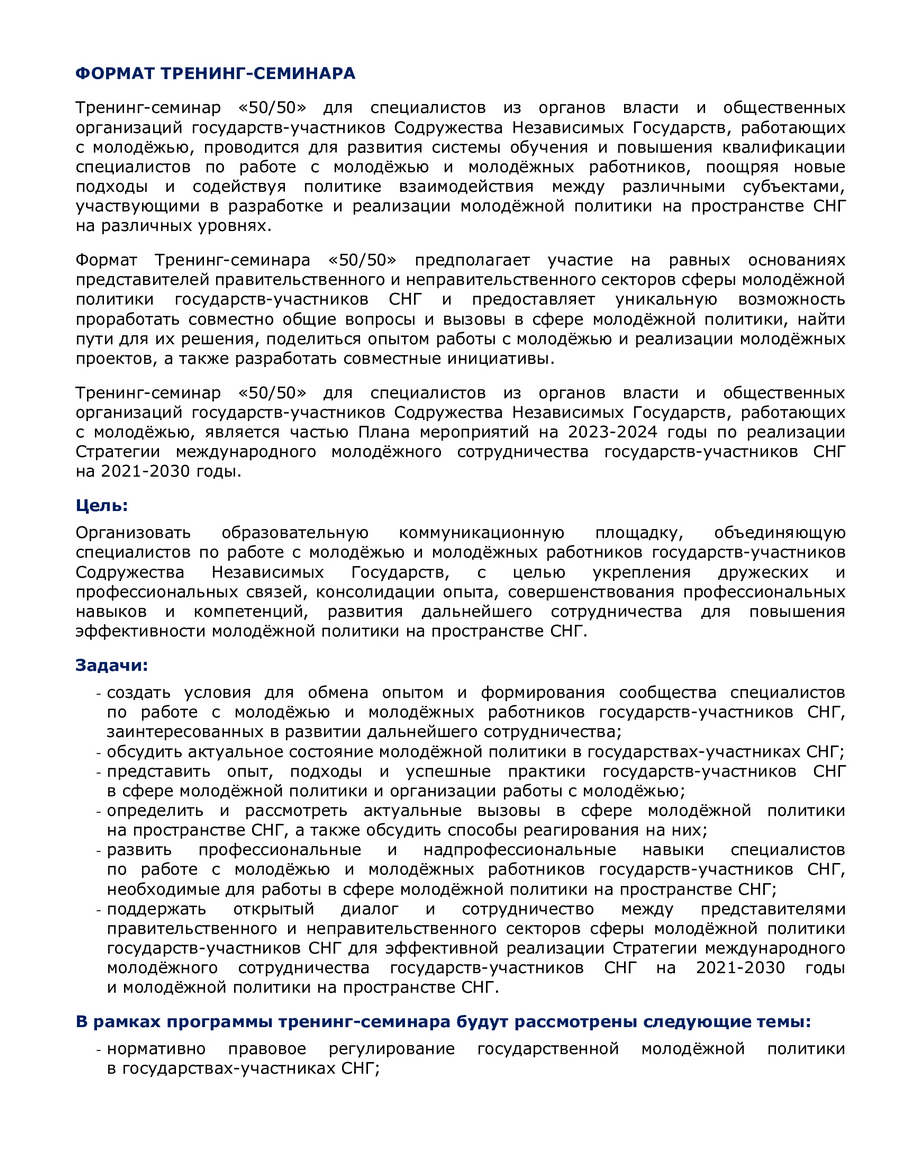 Ассоциация общественных объединений «Национальный Совет молодёжных и детских объединений России» информирует о проведении Тренинг-семинара «50/50» для специалистов из органов власти и общественных организаций государств – участников Содружества Независимых Государств, работающих с молодёжью, который состоится с 19 по 25 мая 2024 года в Москве. Цель Тренинг-семинара – организовать образовательную коммуникационную площадку, объединяющую специалистов по работе с молодёжью и молодёжных работников государств – участников СНГ, с целью укрепления дружеских и профессиональных связей, консолидации опыта, совершенствования профессиональных навыков и компетенций, развития дальнейшего сотрудничества для повышения эффективности молодёжной политики на пространстве СНГ. В Тренинг-семинаре примут участие 40 представителей от правительственного и неправительственного секторов сферы молодёжной политики государств – участников СНГ.