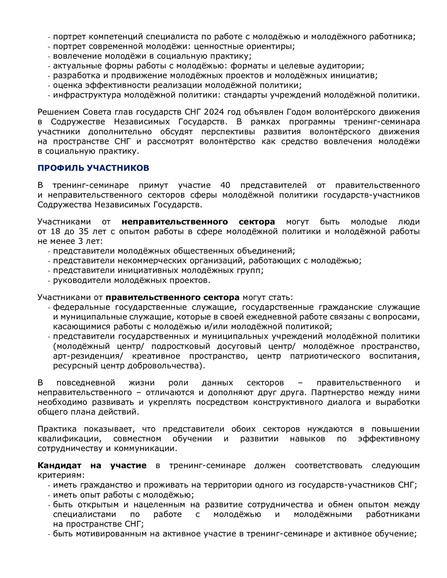 К участию приглашаются специалисты по работе с молодёжью, представители государственных и муниципальных учреждений молодёжной политики, представители молодёжных общественных объединений, представители некоммерческих организаций, работающие с молодёжью, и руководители молодёжных проектов, которые заинтересованы в совершенствовании профессиональных навыков, обмене опытом и развитии дальнейшего сотрудничества с коллегами из государств – участников СНГ.