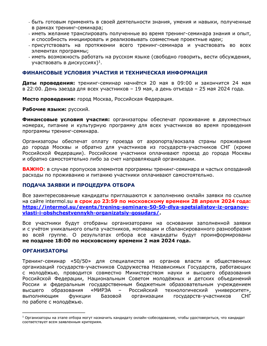 Тренинг-семинар проводится совместно Министерством науки и высшего образования Российской Федерации, Ассоциацией общественных объединений «Национальный Совет молодёжных и детских объединений России» федеральным государственным бюджетным образовательным учреждением высшего образования «МИРЭА – Российский технологический университет», выполняющим функции Базовой организации государств – участников СНГ по работе с молодёжью, во исполнение Плана мероприятий на 2023-2024 годы по реализации Стратегии международного молодёжного сотрудничества государств – участников СНГ на 2021-2030 годы.